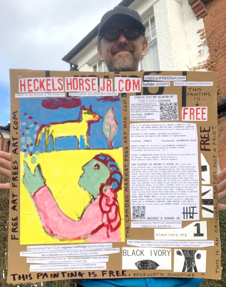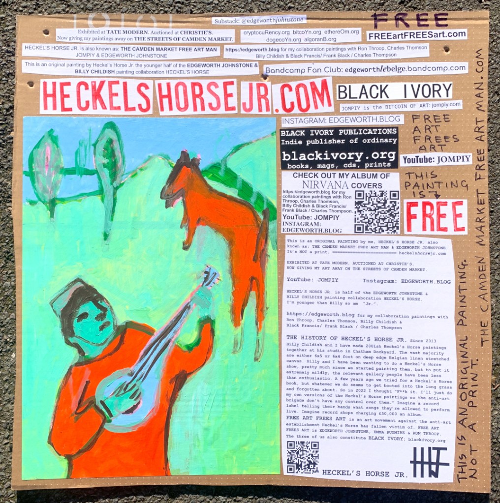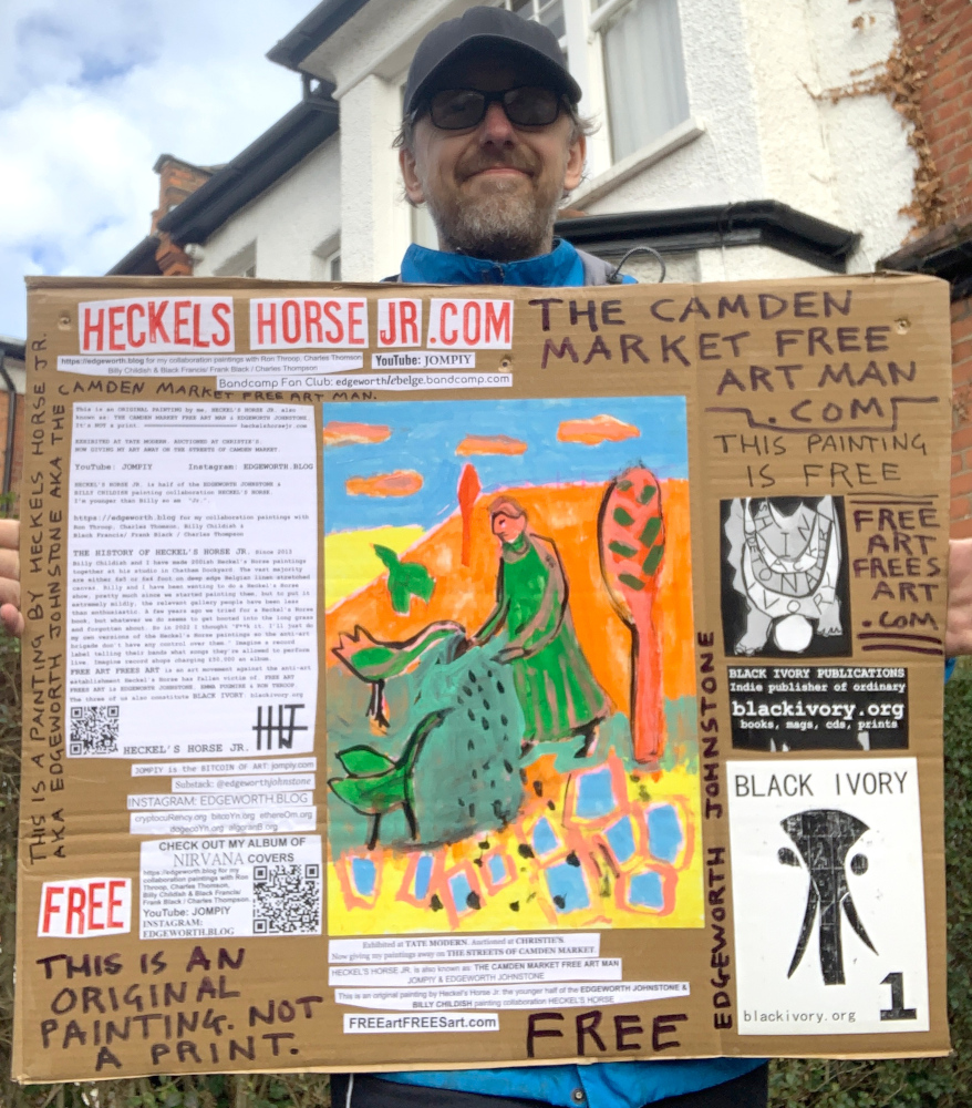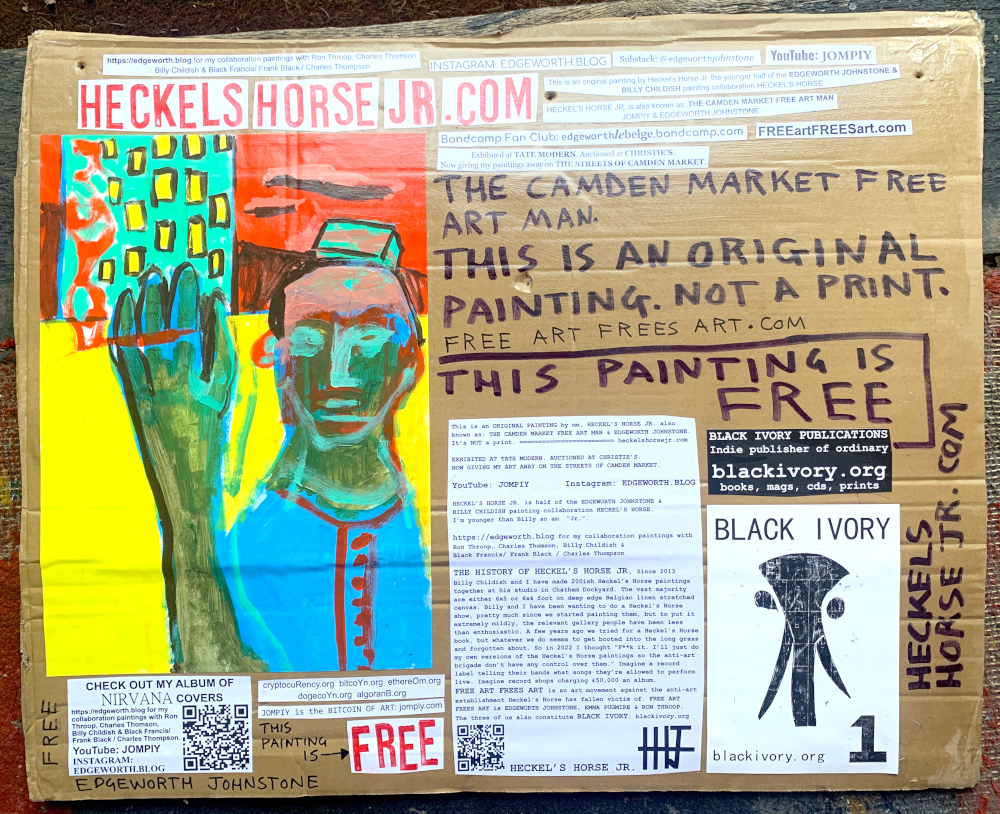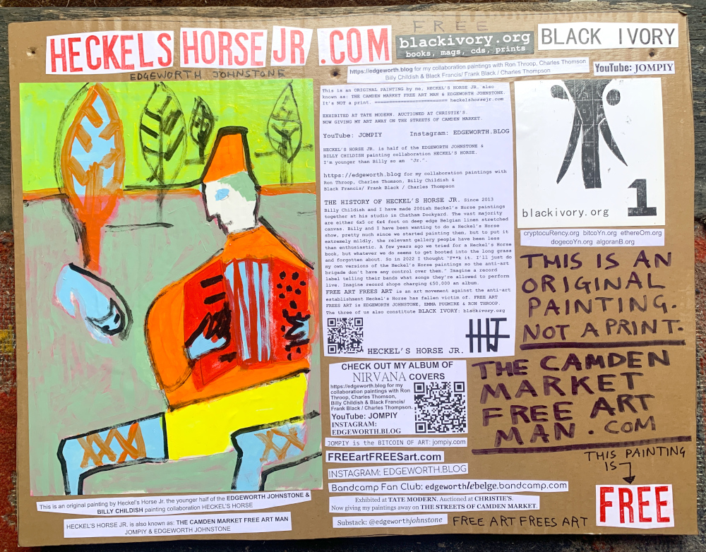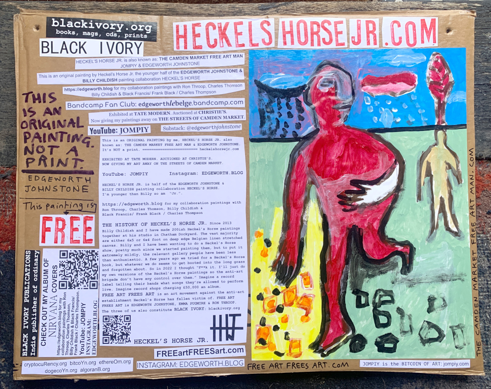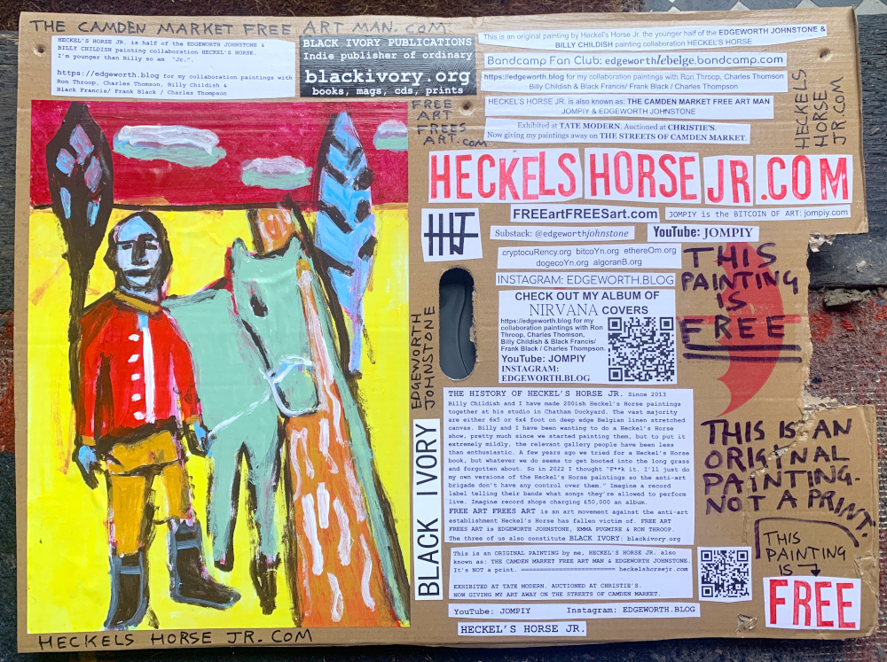 I make these 12 inch Nirvana LPs from second hand vinyl I buy in charity shops. Hand made monoprints on the album cover and face of the vinyl. They come in a clear crystal album sleeve, are signed and numbered and can be bought on my Etsy and Ebay shops. I also give them away at my Camden Market Free Art Man Political Protest Against Expensive Art. If you go to Camden and I’m not there, Moonlight Sculpture sell them on Maker’s Alley, near the Amy Winehouse statue and Cyberdog. See this Instagram post for a clearer picture of where that is: