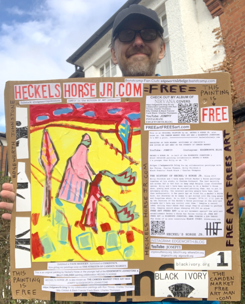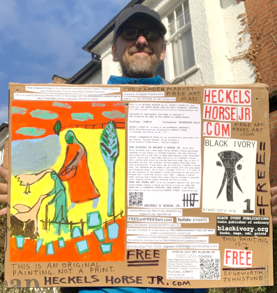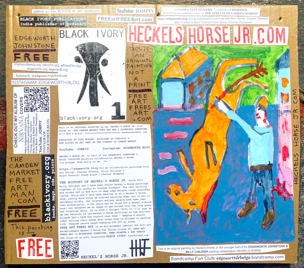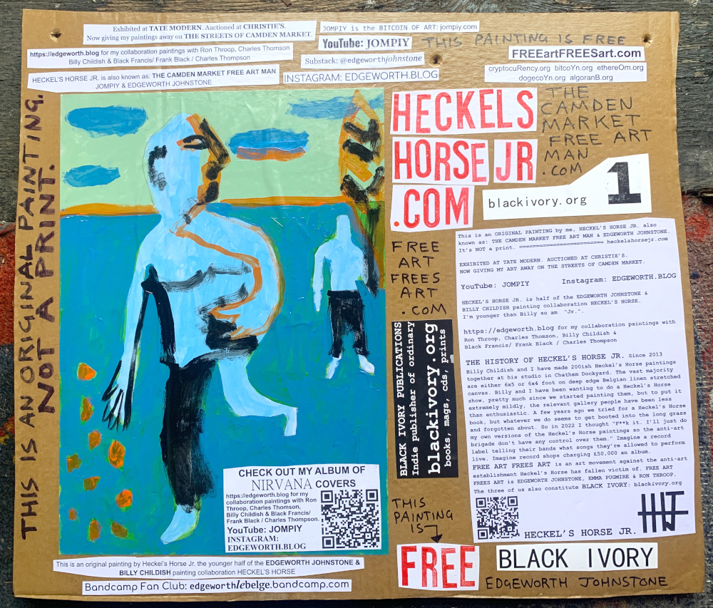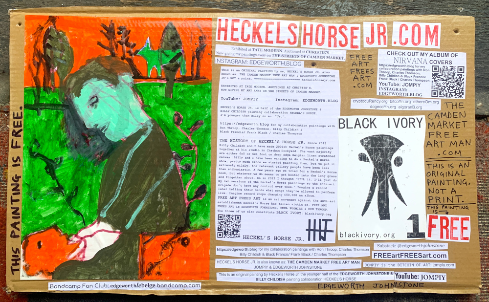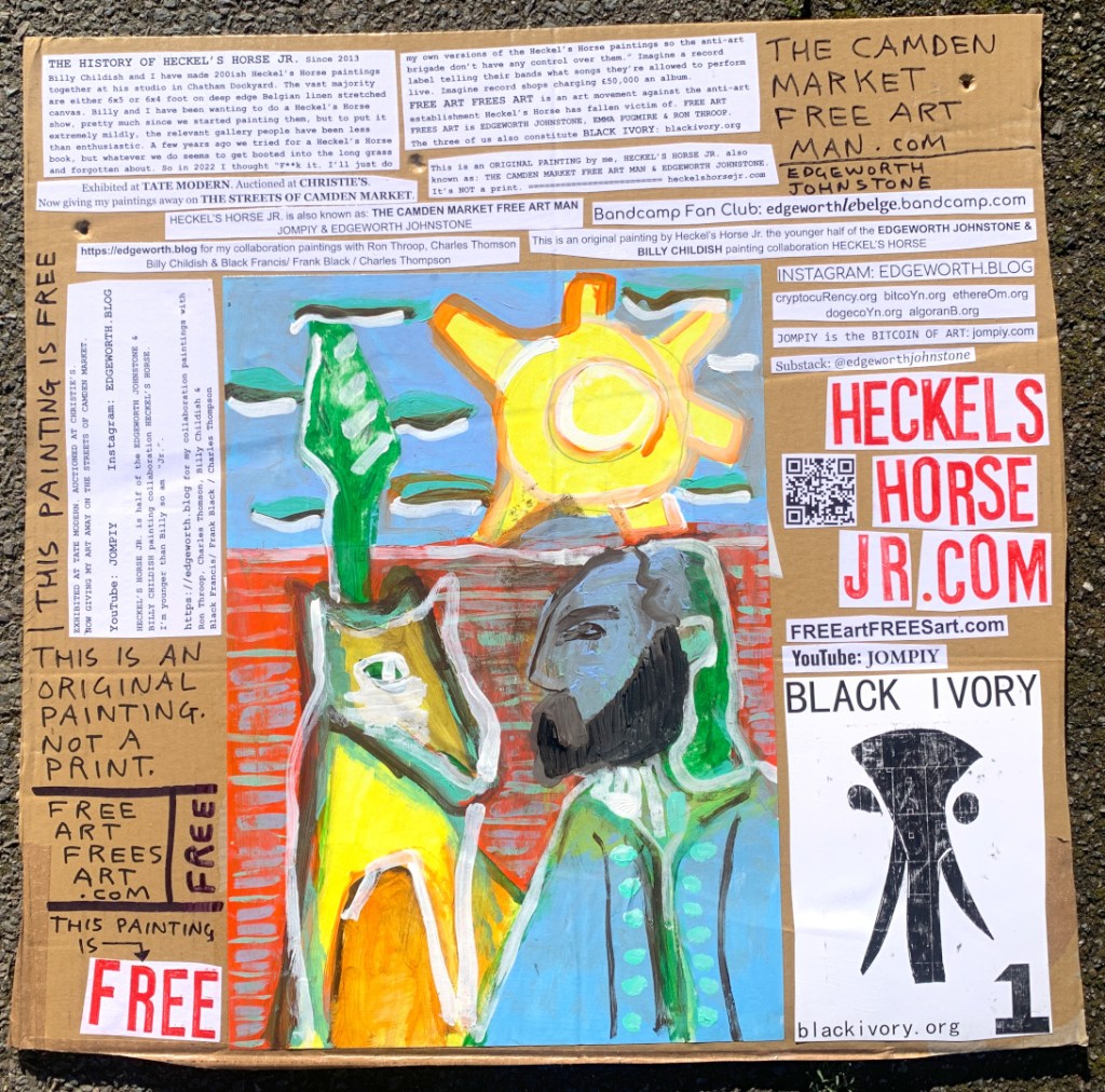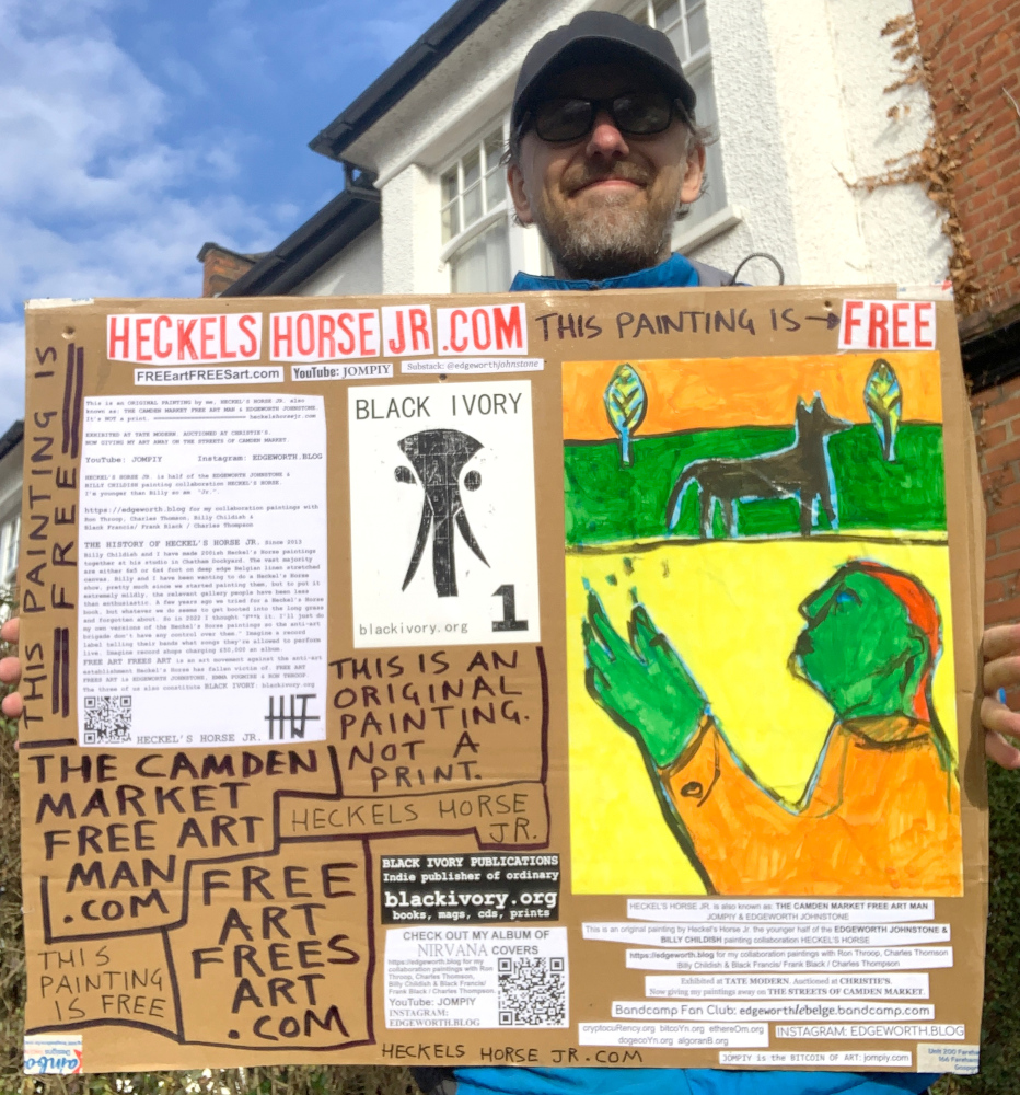 I make these 12 inch Nirvana LPs from second hand vinyl I buy in charity shops. Hand made monoprints on the album cover and face of the vinyl. They come in a clear crystal album sleeve, are signed and numbered and can be bought on my Etsy and Ebay shops. I also give them away at my Camden Market Free Art Man Political Protest Against Expensive Art. If you go to Camden and I’m not there, Moonlight Sculpture sell them on Maker’s Alley, near the Amy Winehouse statue and Cyberdog. See this Instagram post for a clearer picture of where that is:
