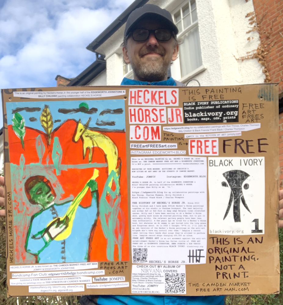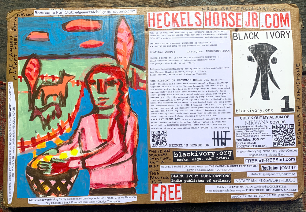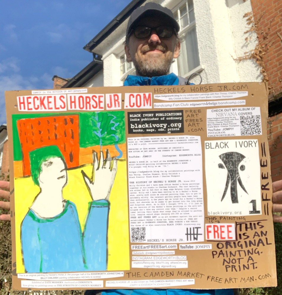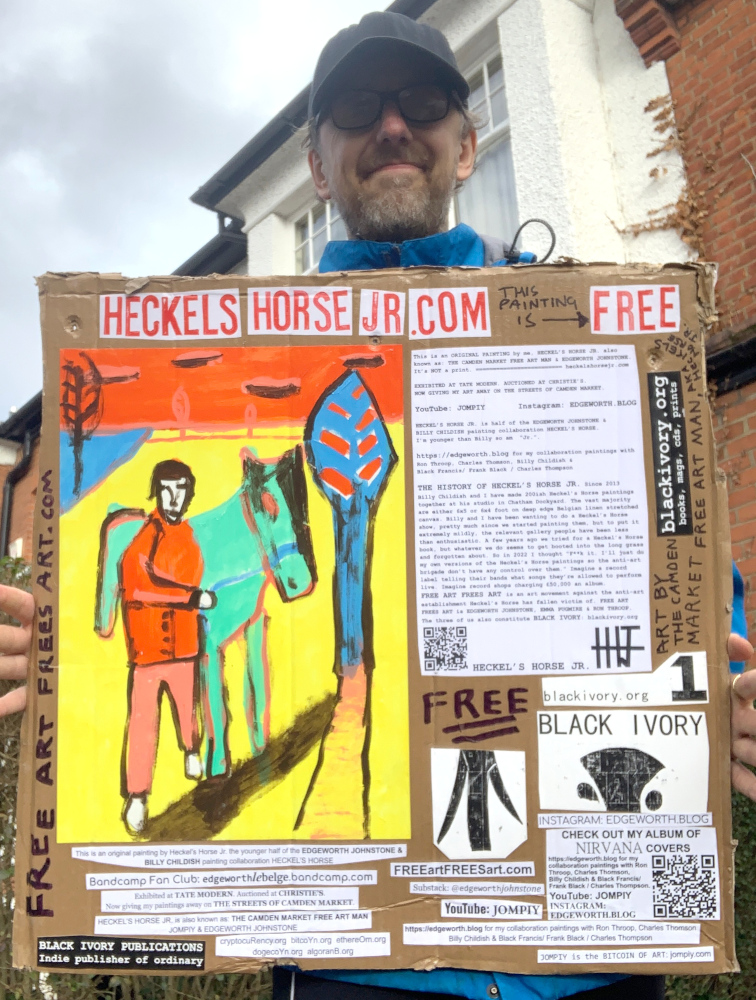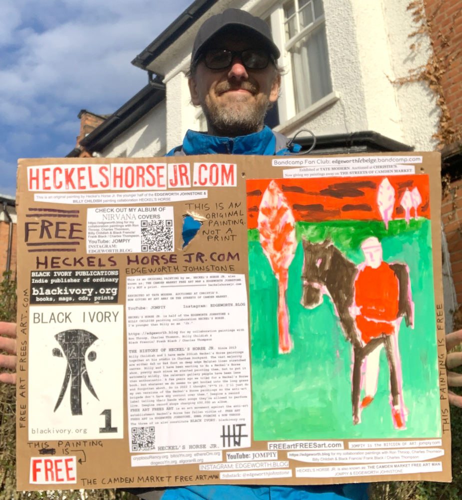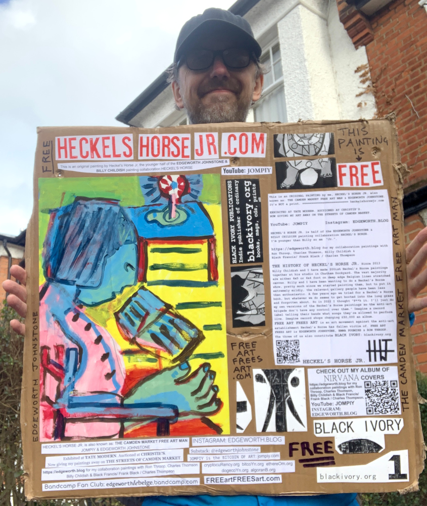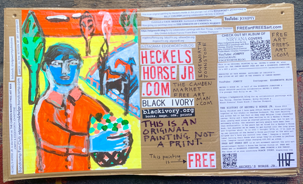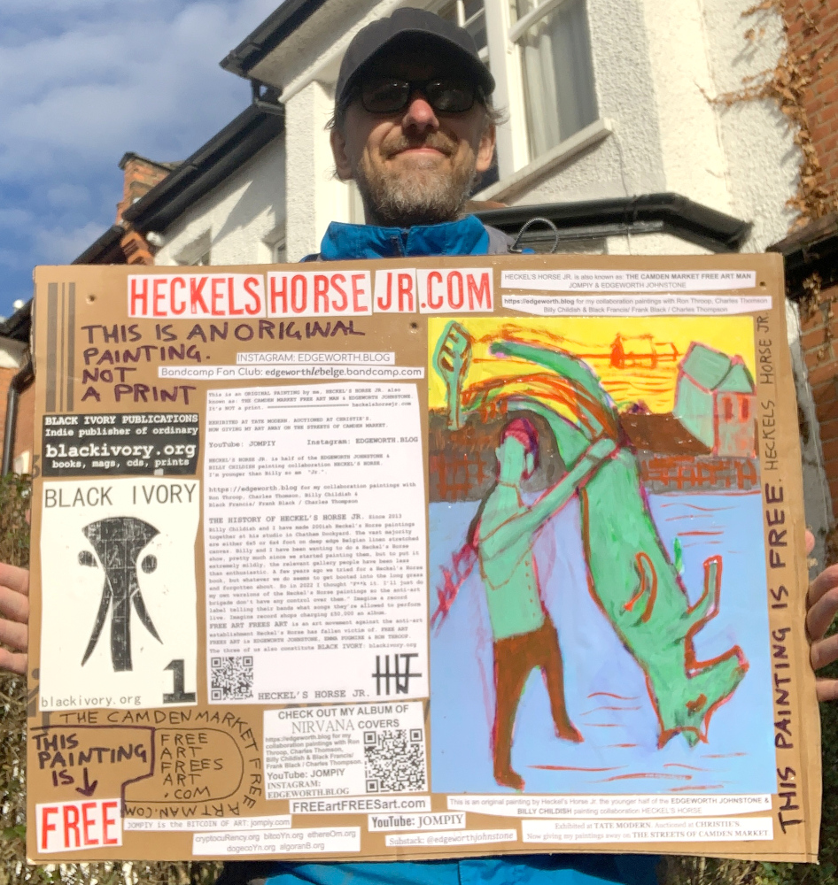 I make these 12 inch Nirvana LPs from second hand vinyl I buy in charity shops. Hand made monoprints on the album cover and face of the vinyl. They come in a clear crystal album sleeve, are signed and numbered and can be bought on my Etsy and Ebay shops. I also give them away at my Camden Market Free Art Man Political Protest Against Expensive Art. If you go to Camden and I’m not there, Moonlight Sculpture sell them on Maker’s Alley, near the Amy Winehouse statue and Cyberdog. See this Instagram post for a clearer picture of where that is: