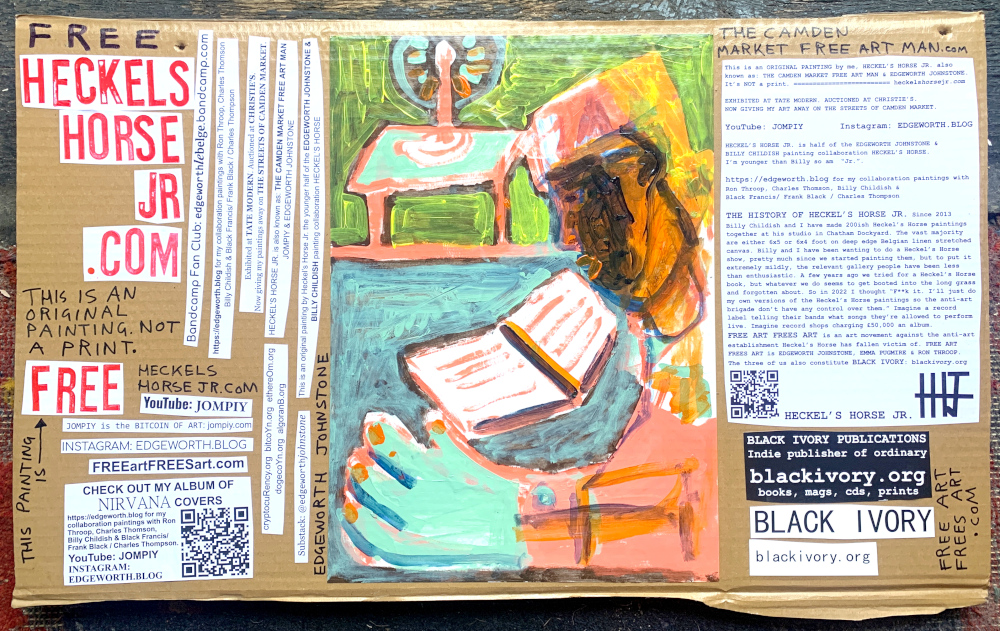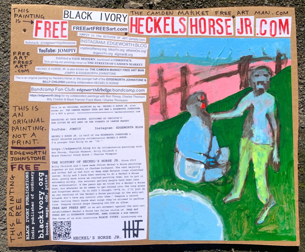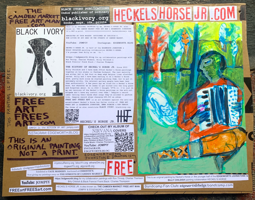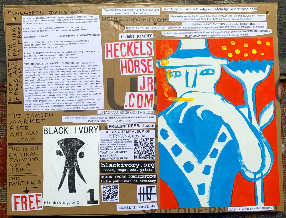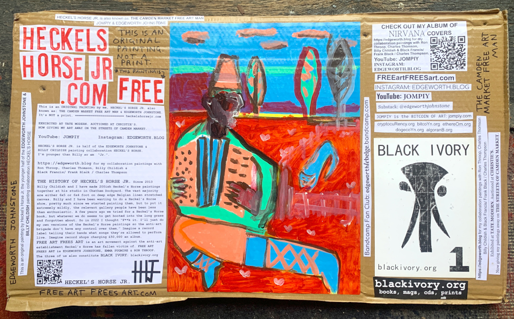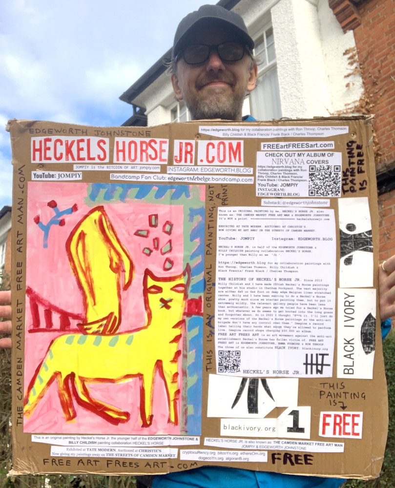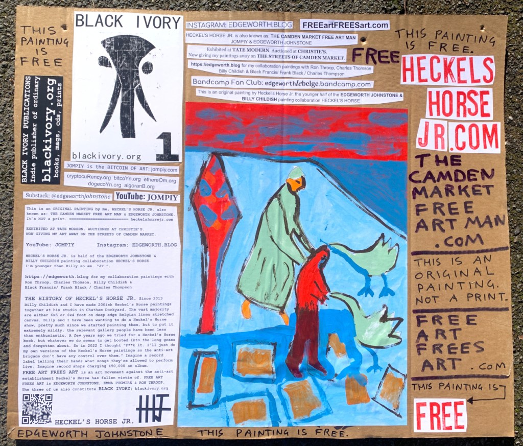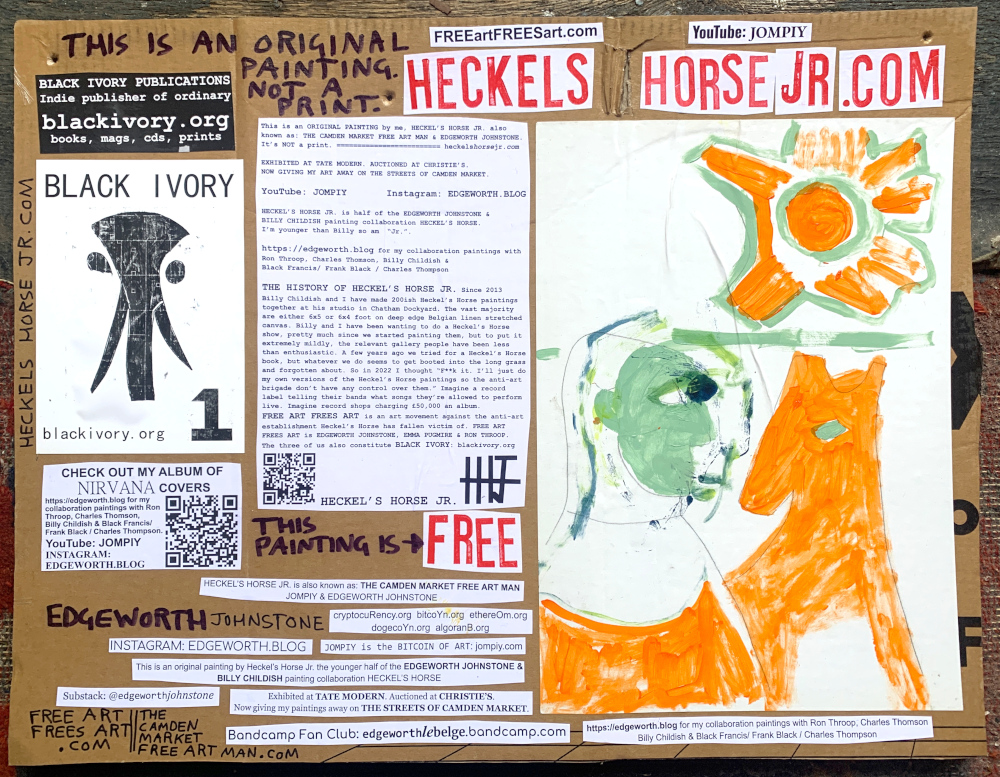 I make these 12 inch Nirvana LPs from second hand vinyl I buy in charity shops. Hand made monoprints on the album cover and face of the vinyl. They come in a clear crystal album sleeve, are signed and numbered and can be bought on my Etsy and Ebay shops. I also give them away at my Camden Market Free Art Man Political Protest Against Expensive Art. If you go to Camden and I’m not there, Moonlight Sculpture sell them on Maker’s Alley, near the Amy Winehouse statue and Cyberdog. See this Instagram post for a clearer picture of where that is: