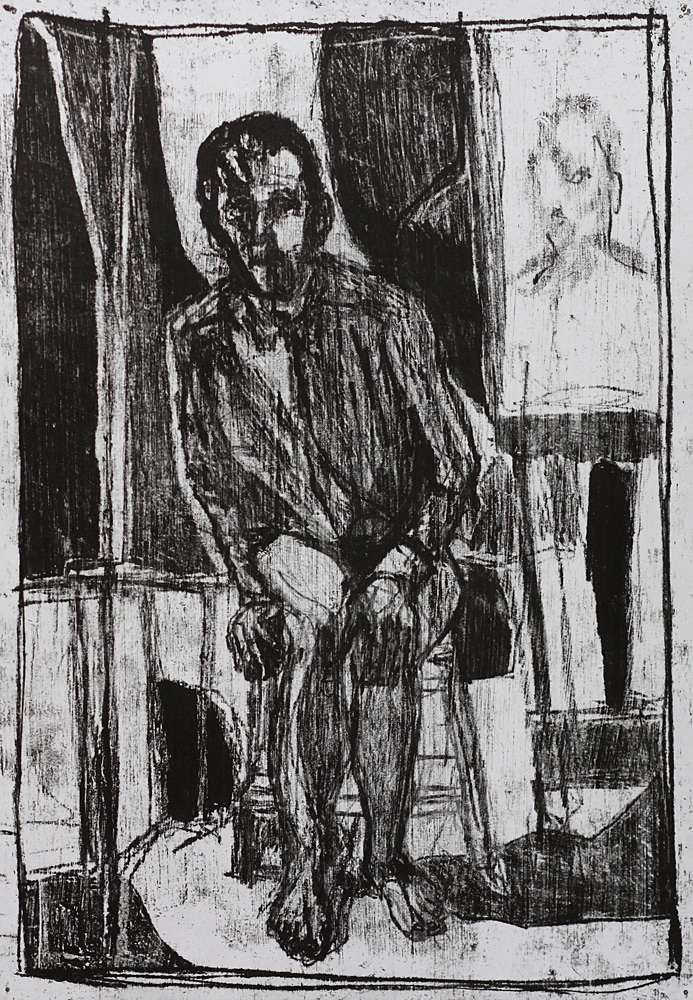 Self-portrait sat by a painting