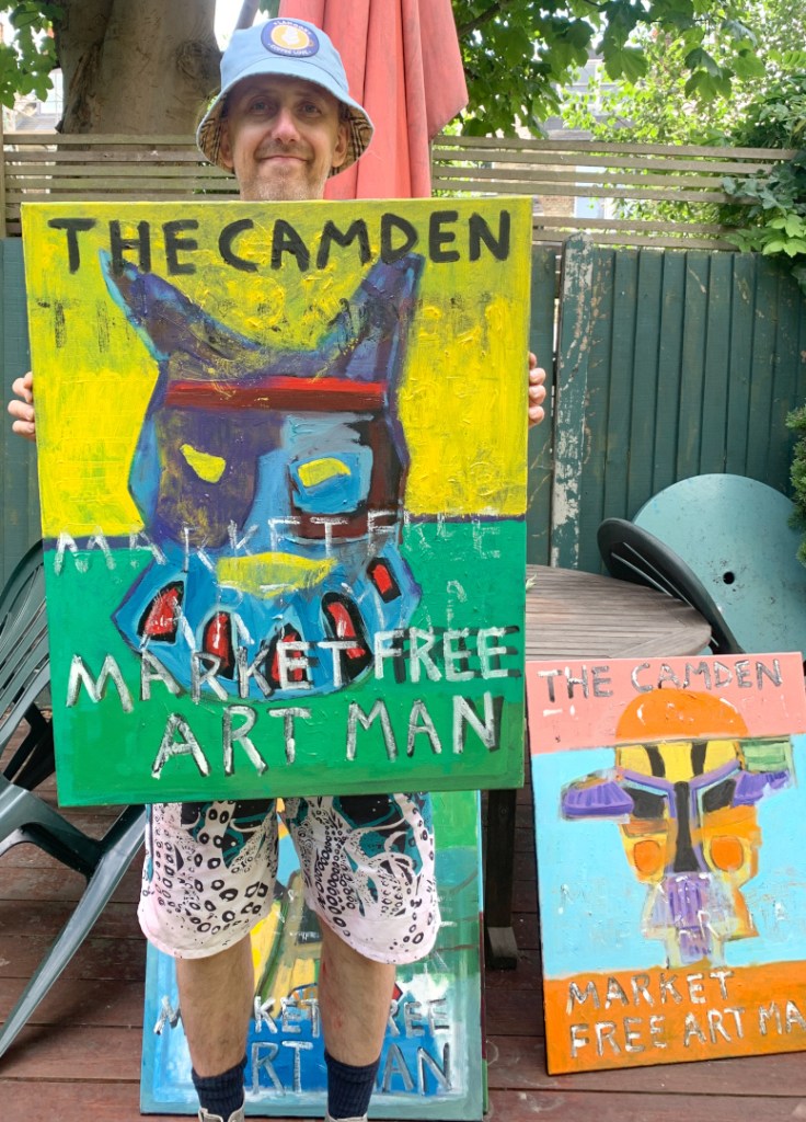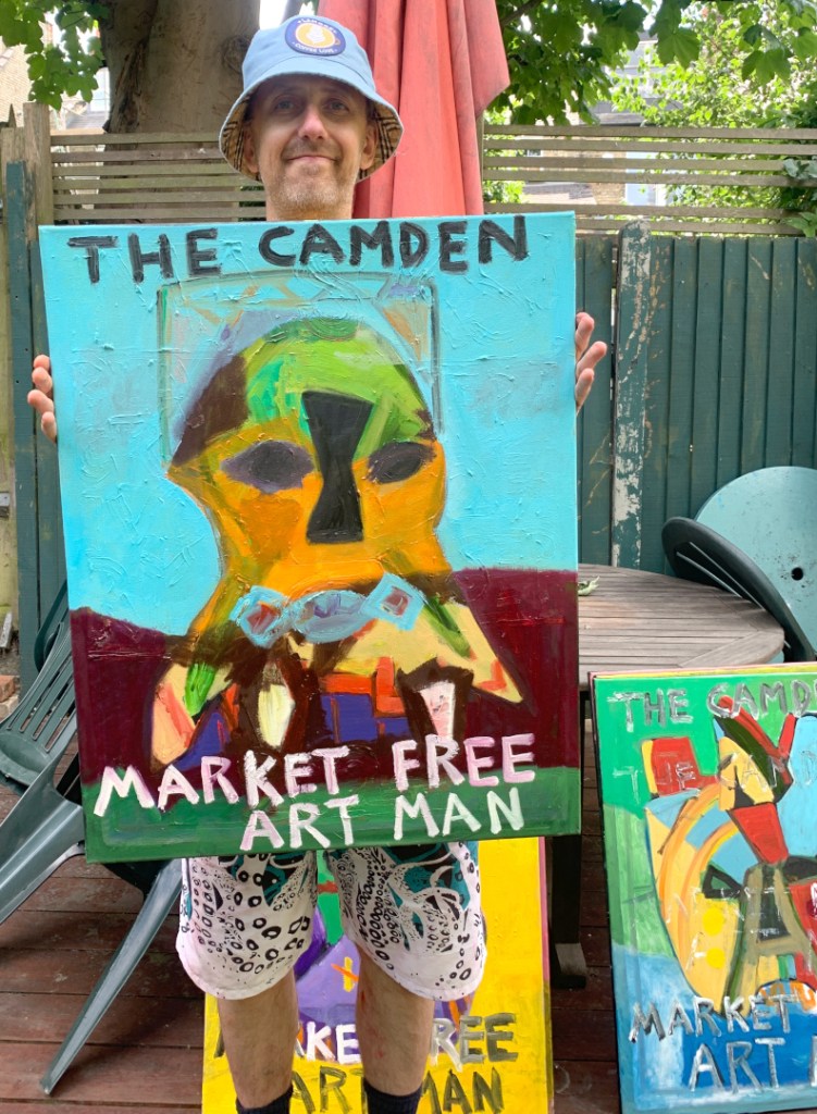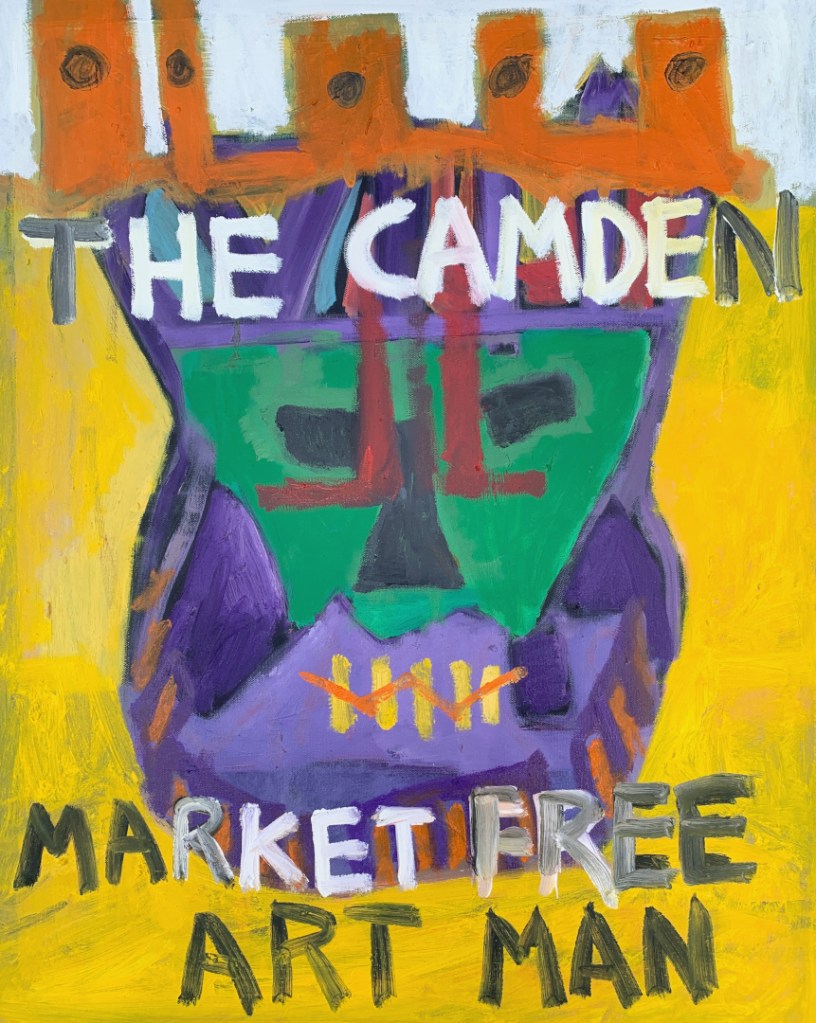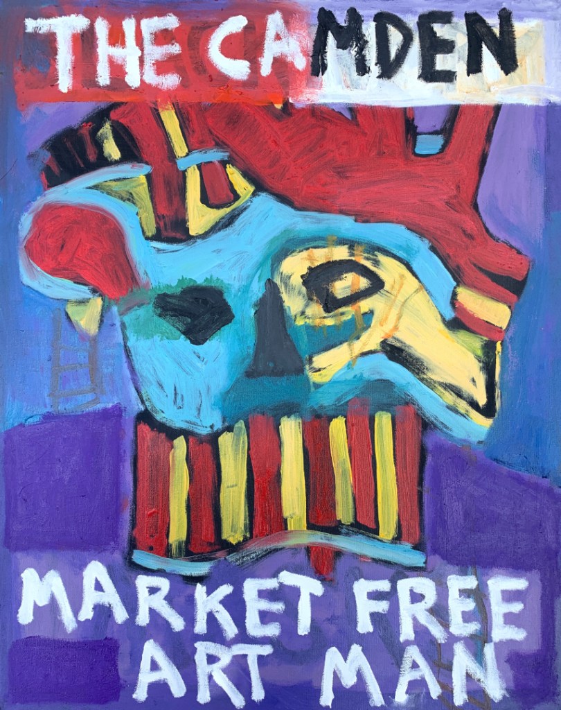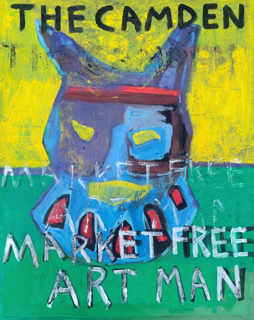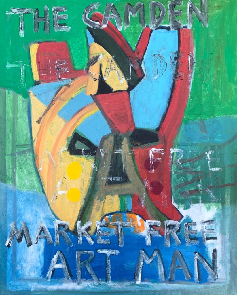 30 x 24 inch oil on canvas. Some are in my Etsy shop. A combination of masks and The Camden Market Free Art Man.