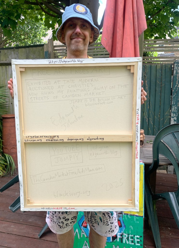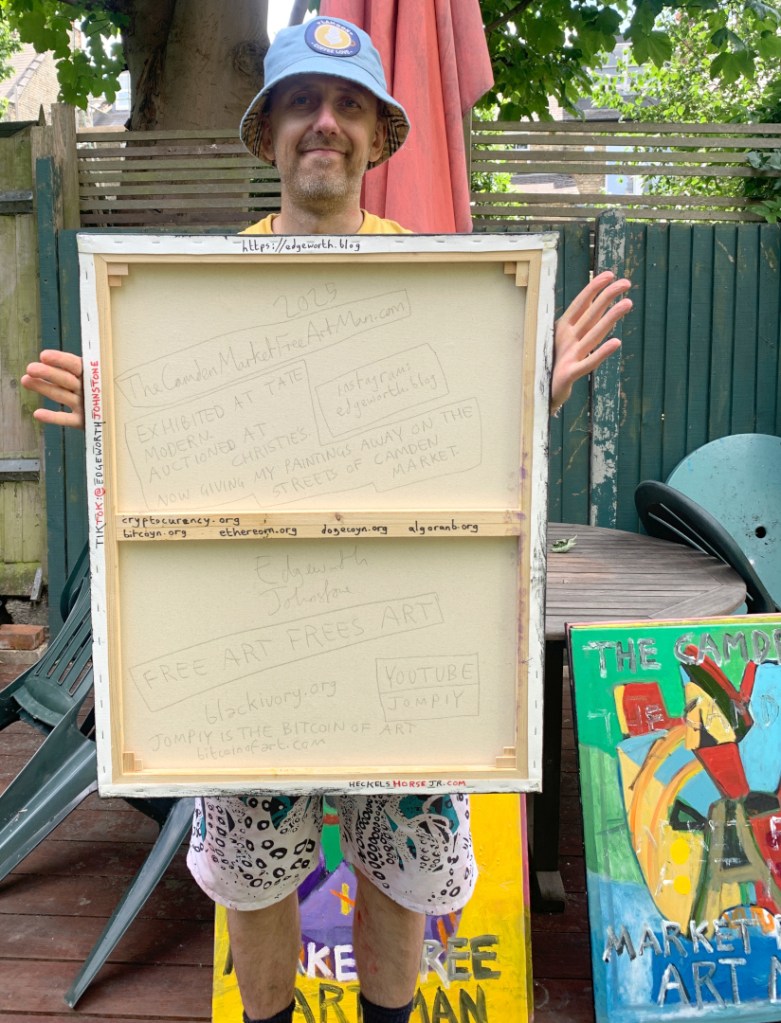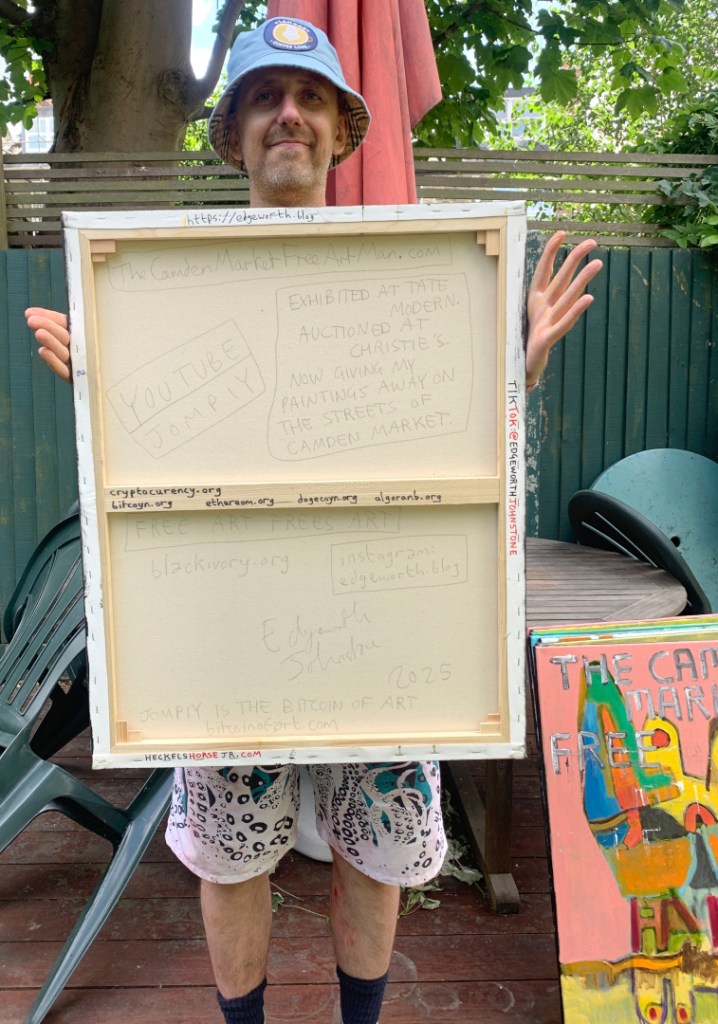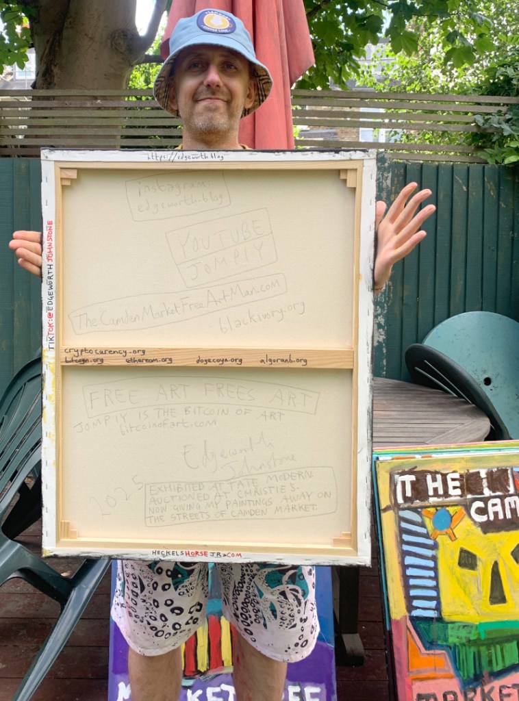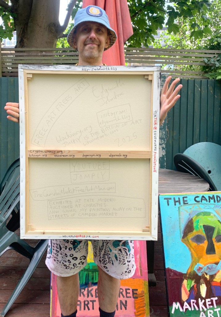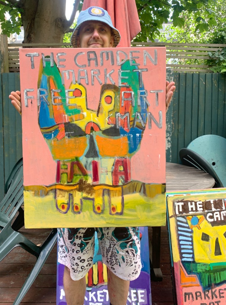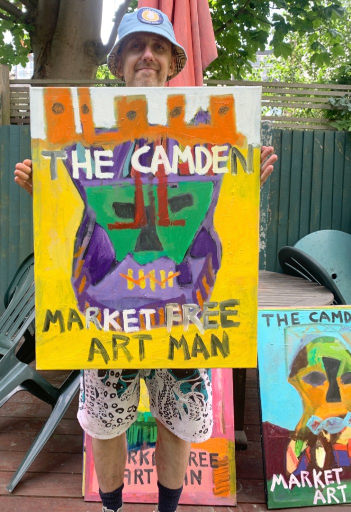 30 x 24 inch oil on canvas. Some are in my Etsy shop. A combination of masks and The Camden Market Free Art Man.